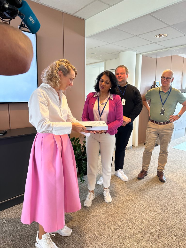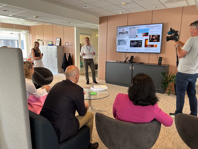 Svindelekspert Johannes Myhre Vallesverd gav statsråden ei kort innføring i det nasjonale og internasjonale arbeidet som no blir gjort i kampen mot digital svindel. Nkom er med i leiinga av dei nasjonale og globale initiativa. Vallesverd er ein av dei nasjonale ekspertane som jobbar for å styrkje det digitale skjoldet rundt Noreg, slik at færre blir utsette for digital svindel. Arbeidet har gitt viktige resultat, og statsråden fekk høyre korleis 10 millionar svindelanrop til norske mobiltelefonar blei stoppa i mai månad.