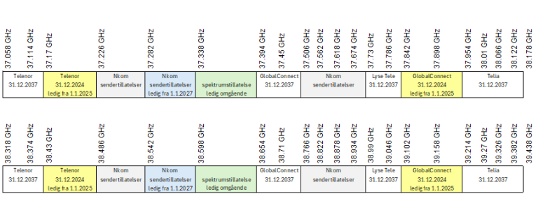 - 37170-37226 MHz og 38430-38486 MHz ledig 1. januar 2025 og markert gult i figur 1